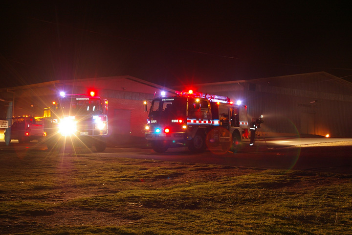 September 17, 2006: A showgrounds pavilion was damaged and several bins were destroyed in a series of fires in Bendigo this evening. CFA crews from Bendigo were called to the blazes at the Prince of Wales Showgrounds in North Bendigo just after 10:00 this evening after a passing police patrol noticed flames coming from a garbage bin. By the time firefigters arrived, one of the fires had spread to a neighboring pavilion, causing moderate damage, and additional units from Eaglehawk were requested. Firefighters wearing breatinh apparatus entered the building and took about half an hour to extinguish the fires. Witnesses report hearing explosions and seeing children in the area at the time of the fires. Police investigations are continuing.